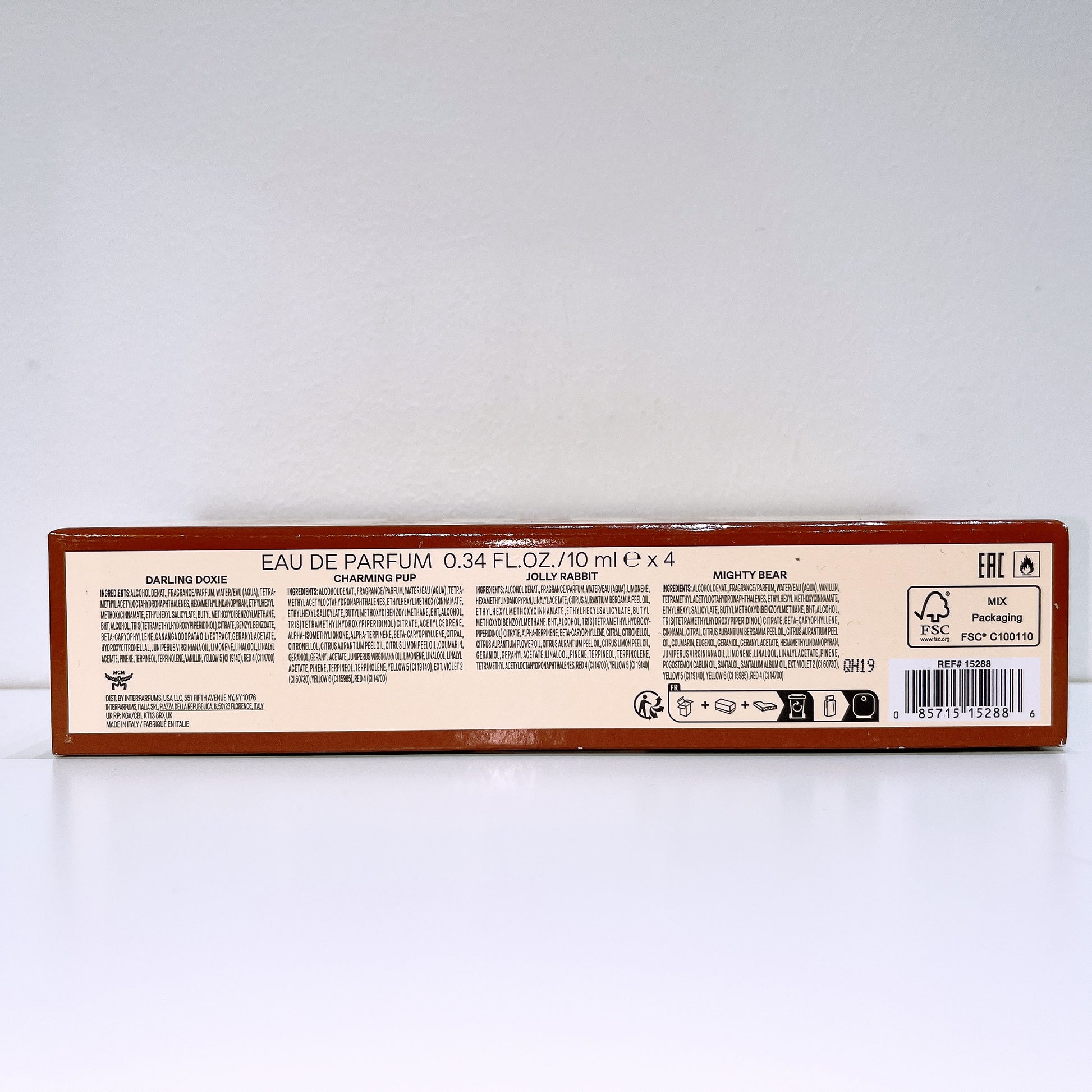 This Set Contains: - 4 x 10 ml fragrances in Darling Doxie Eau de Parfum, Charming Pup Eau de Parfum, Jolly Rabbit Eau de Parfum, Might Bear Eau de Parfum