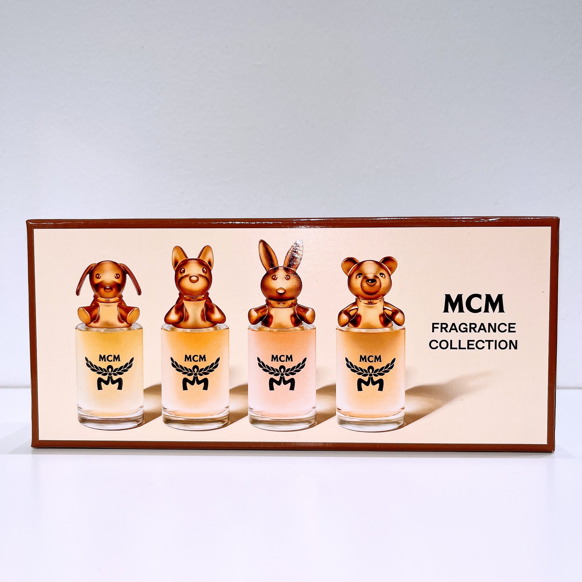 Embark on a whimsical journey with the MCM Mini Fragrance Collection Set, a curated selection of four enchanting Eau de Parfums. Inspired by the iconic animal mascots of the esteemed German fashion house, this set invites you to discover your own spirit animal through the power of scent. A Quartet of Captivating Scents: This delightful collection features four distinct fragrances, each housed in a charming, collectible bottle adorned with a playful animal topper that reflects the unique character of the scent within: Darling Doxie: A sophisticated and alluring scent that captures the playful spirit of the dachshund. Charming Pup: A fresh and vibrant fragrance that embodies loyalty and joy. Jolly Rabbit: A whimsical and energetic aroma that evokes a sense of playful adventure. Mighty Bear: A powerful and bold fragrance that exudes confidence and strength.