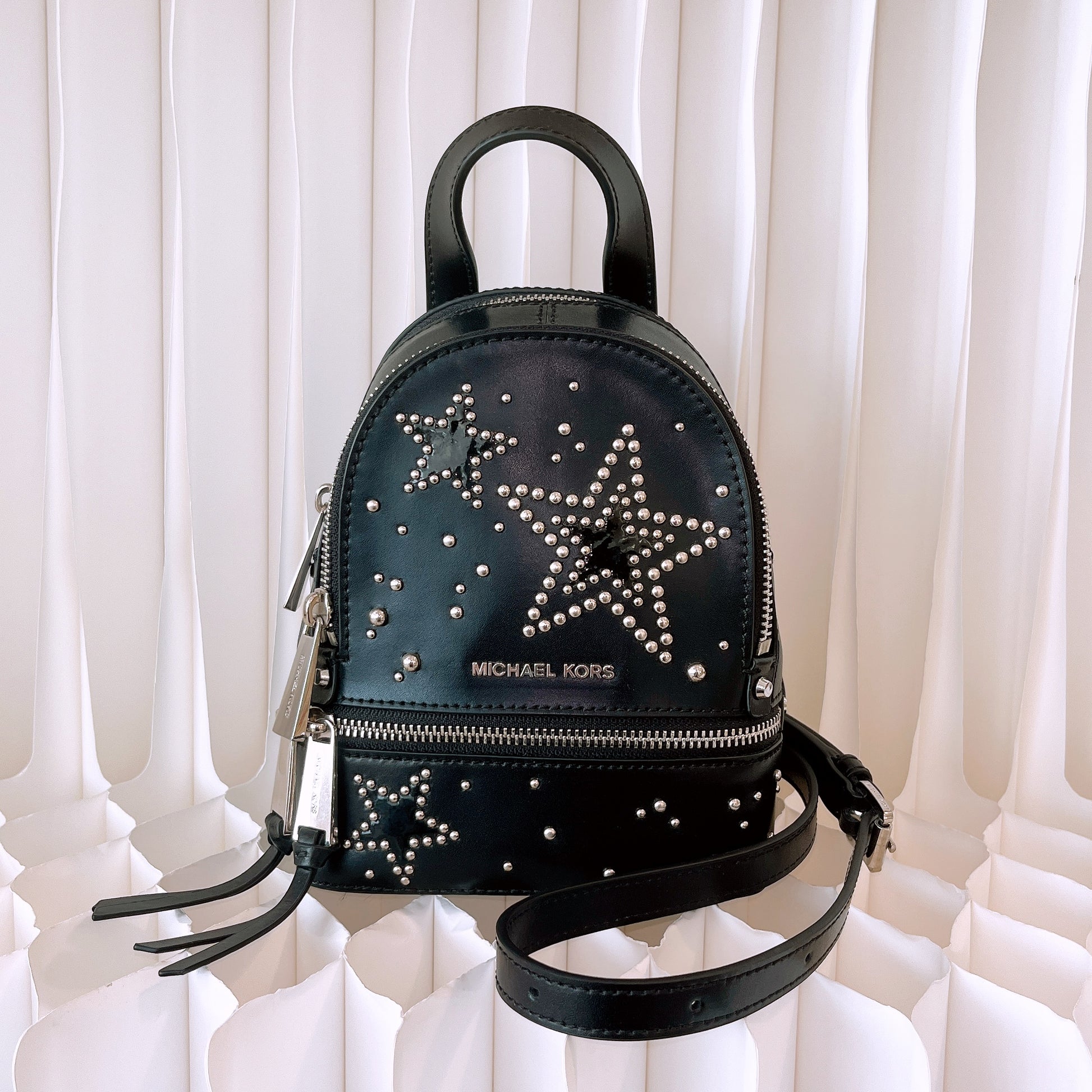 Michael Kors Black Rhea Studded Star Mini Messenger Zip Backpack Bag