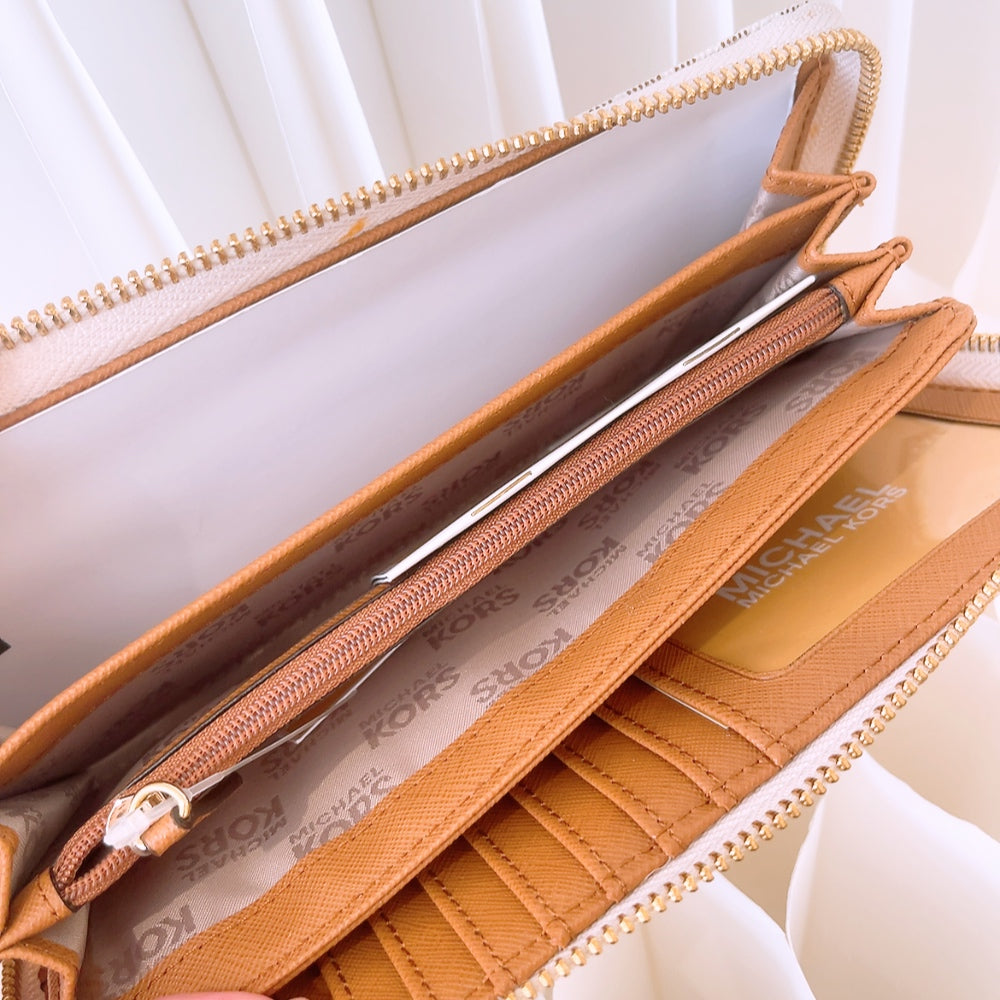 Elegant and stylish, this Michael Kors wallet in vanilla and acorn is perfect for any occasion. Its sleek design and premium quality make it a must-have accessory.