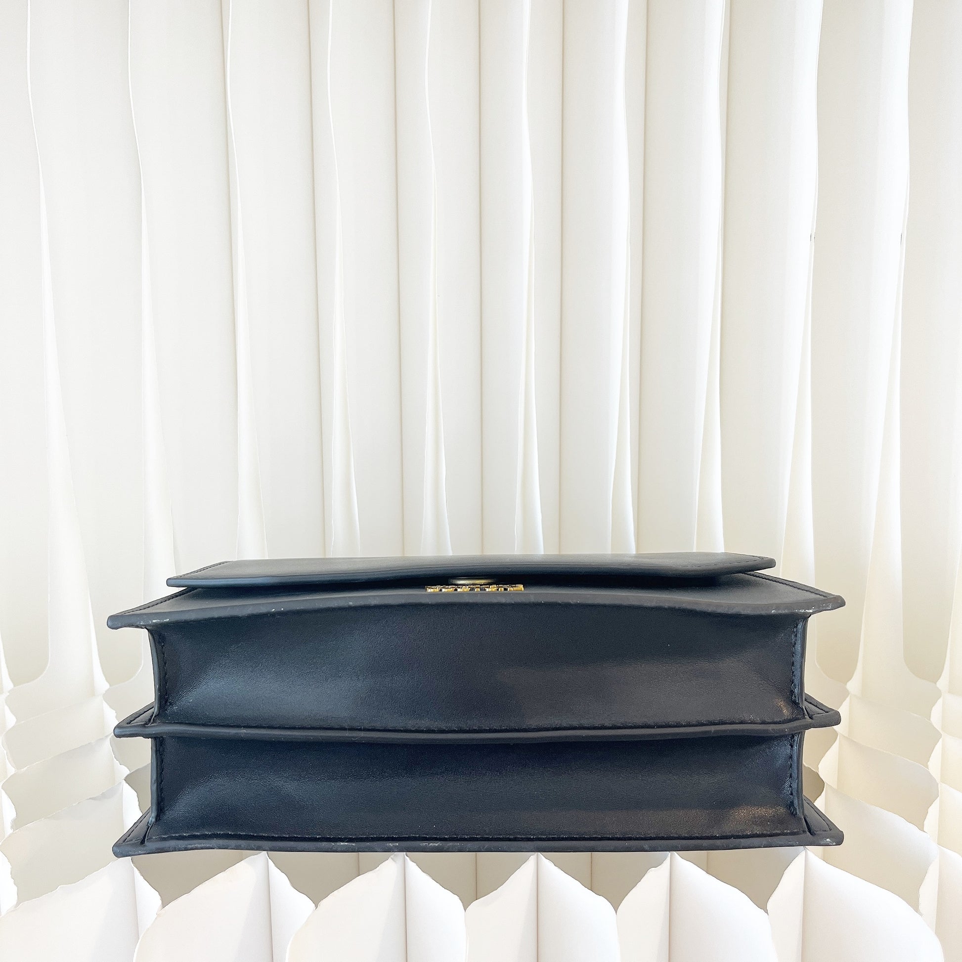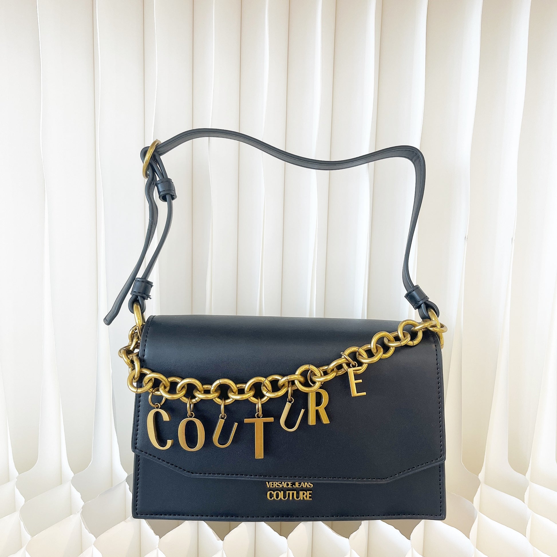 Buffed faux-leather shoulder bag in black. · Chain link carry handle featuring logo charms at top · Detachable chain link shoulder strap with strap pad · Logo hardware at face · Foldover flap · Patch pocket at interior · Full satin lining · H4 x W7.5 x D2.25 in Supplier color: Black